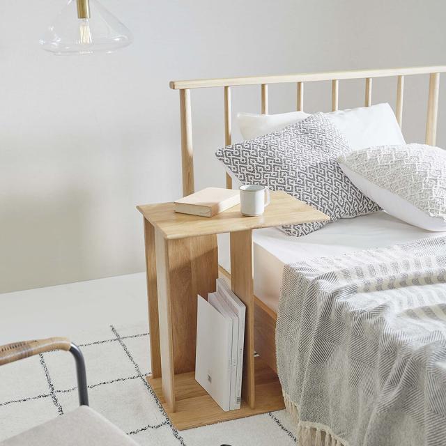 ベッドと合わせてナイトテーブルにすれば本・時計・マグカップを手近に置けてリラックスタイムや身支度をやさしくサポート。