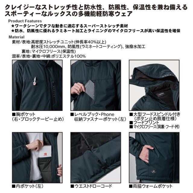 | ★ワークシーンでタフな動きに適応するスーパーストレッチ素材 ★防水、防風性に優れるラミネート加工とライニングのマイクロフリースが高い保温性を確保 | |