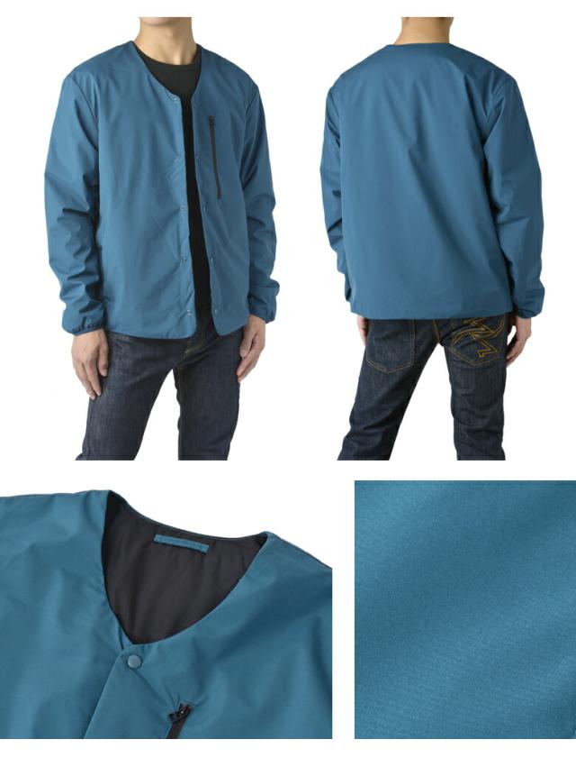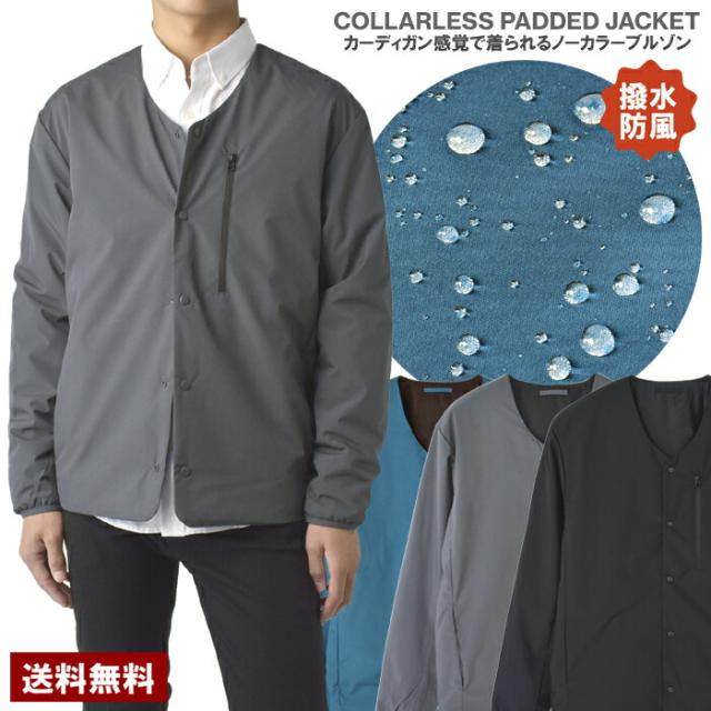 メンズ 撥水 防風 保温 ノーカラージャケット Vネック カーディガン ブルゾン 秋冬アウター 中綿ジャケット フェイクダウン ミドルアウター ストレッチ ブルー グレー ブラック【A2X】