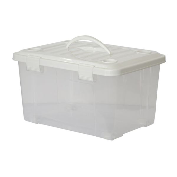 ラクに開閉できるロック構造の収納ボックス。 プラスチック製。