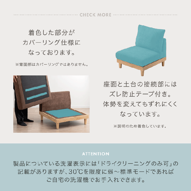※本ソファのカバーはご家庭でお洗濯可能です。製品についている洗濯表示には「ドライクリーニングのみ可」の記載がありますが、30℃を限度に弱?標準モードであればご自宅の洗濯機でお手入れできます。