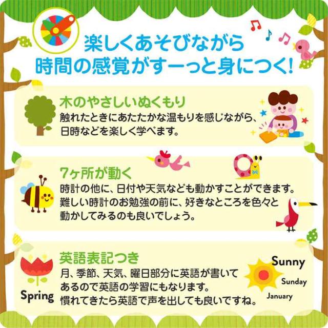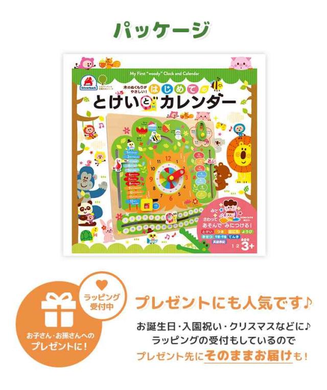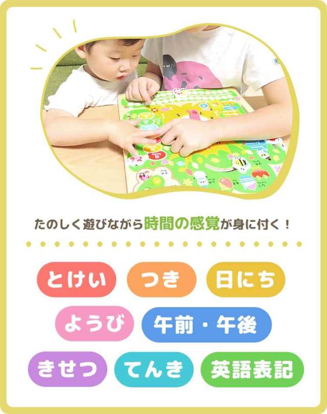 Details 【はじめてのとけいとカレンダー】 時間に興味を持ち始める3才からのお子様にぴったり!遊びながら時間や月日について学べる、木製の時計とカレンダーのおもちゃです。そのままリビングに置いたり壁にかけたりしてもかわいいデザイン!ご自身のお子様はもちろん、お孫さんやお友達のお子様へのプレゼントやお祝いにもぴったりのアイテムです。 品番 12937 サイズ パッケージ:約H31×W31×D3cm 本体:約H30×W30×D2cm 重量 約440g 素材 木、シリコン(背面固定部材)、鉄 (ネジ) 生産国 中国 注意書 ※小部品があります。誤飲・窒息の危険がありますので3才未満のお子様には絶対に与えないでください。 ※表記サイズより、多少の誤差があることがございます。 ※商品の画像はできる限り実物に近づけるよう配慮しておりますが、お使いのモニターやご覧になる環境によりましてはカラーの見え方に差が出る場合がございます。ご了承くださいませ。 関連キーワード 時計 おもちゃ 知育玩具 木製 はじめてのとけいとカレンダー 動く 木のおもちゃ 子供 子ども キッズ 3歳 4歳 5歳 男の子 女の子 誕生日 クリスマス 夏休み こどもの日 プレゼント ギフト 贈り物 お祝い 保育園 幼稚園 入園 準備 算数 さんすう 英語 曜日 月日 時間 練習 学習 シルバーバック 知育時計 学習時計 パズル 勉強 教材 学べる 電池不要 こども 幼児 小学校 低学年 年長 年中 年少 孫 甥 姪 かわいい 可愛い おしゃれ カラフル 動物 虫 鳥 柄 壁掛け 家族で遊べる 遊びながら学べる 6歳 7歳 小学 1年 2年 一年 二年 小学校 保育所 先生 学生 学校 入園 入学 準備 入園準備 入学準備 通園 通学 通勤 ジュニア 赤ちゃん ベイビー ベビー baby 息子 娘 女子 ガールズ girl 男子 ボーイズ boy 父 母 おかあさん おとうさん パパ ママ シニア おじいちゃん おばあちゃん お爺ちゃん お婆ちゃん 祖父 祖母 じいじ ばあば バースデー プレゼント プチ ミニ ギフト イベント クリスマスプレゼント オシャレ お洒落 カワイイ | |||||||||||||