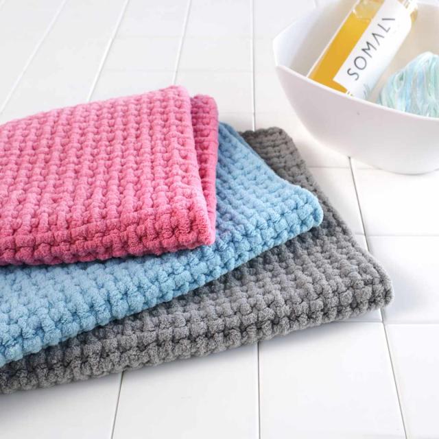 抗菌防臭加工済みで繊維上の細菌の増殖を抑制し、バイキンや気になるニオイをしっかり防ぎます。タオルのようなバスマットなので、汚れたら手軽にサッと洗え、すぐに乾きます。