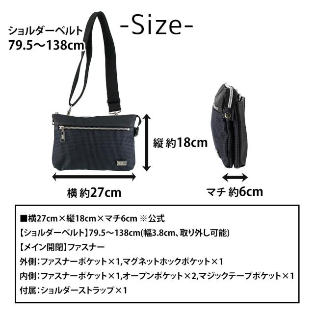 | サイズ(約) ※当店実寸値 | 公式サイズ 横27cm×縦18cm×マチ6cm 【ショルダーベルト】79.5〜138cm(幅3.8cm、取り外し可) | ||