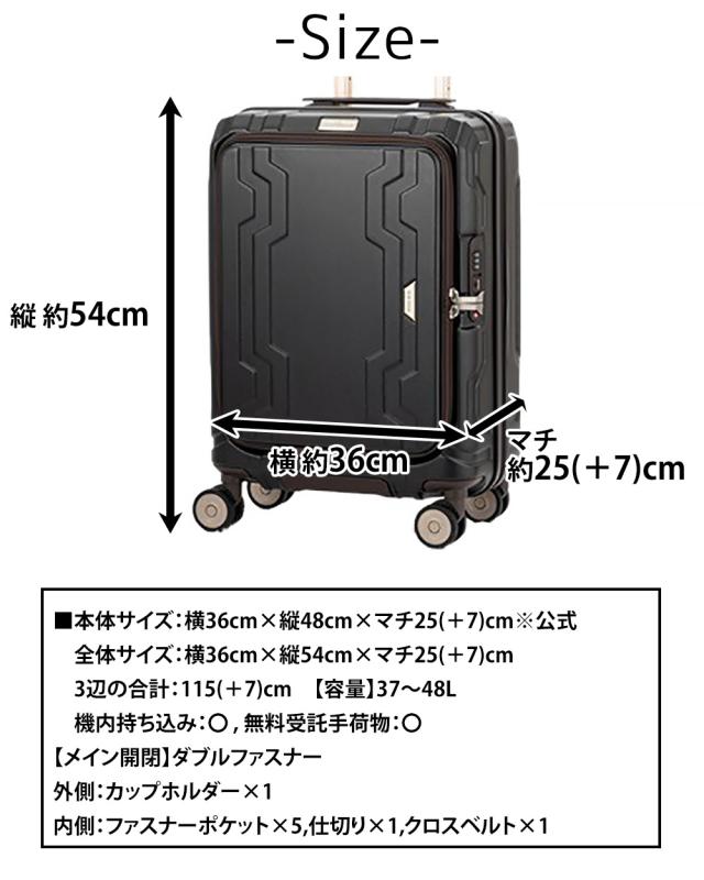 | サイズ(約) ※当店実寸値 | 公式サイズ 本体:横36cm×縦48cm×マチ25(+7)cm 公式サイズ 全体:横36cm×縦54cm×マチ25(+7)cm 3辺の合計:115(+7)cm 無料受託手荷物 158cm以内: 〇 【容量】37〜48L ※全体サイズはキャスター・ハンドルを含んだサイズになります。 | ||