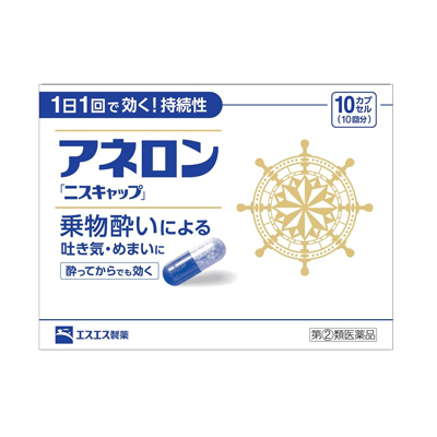 ●アネロン「ニスキャップ」は、乗物酔いによる吐き気・めまい・頭痛といった症状の予防・緩和にすぐれた効果をあらわすカプセル剤です。