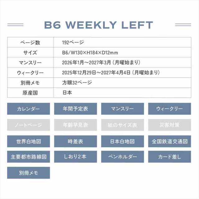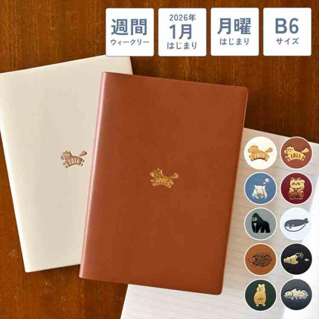 ![]() ![]() 型押しのワンポイントが大人心をくすぐる「MATOKA」の2026年1月始まりダイアリー。 ![]() カバーの裏にもワンポイントがあり、デザインの違いを楽しめます。 ![]() ![]() ![]() ![]() ![]() ![]() ![]() ![]() Details 【2026年1月始まり ウィークリー・レフト手帳】 小さなワンポイントが大人可愛いウィークリー手帳。 ビジネスなどシーンを問わず使えるシンプルなデザインです。 ウィークリーページはスケジュール管理しやすいレフトタイプ。 左ページには8時から24時までの17時間をホリゾンタル形式で配置し、 1日の予定を時間ごとに細かく書き込めます。 右ページはTO DOリストやメモに便利なドット方眼スペースです。 使用期間は「2026年1月」から「2027年3月末」までの15ヶ月間。 見た目の可愛さと機能性を兼ね備えた、毎日を快適にサポートする手帳です。 ブランド名 MATOKA / マトカ 品番 DR-WB-475 / DR-WB-476 / DR-WB-479 / DR-WB-480 / DR-WB-481 / DR-WB-482 / DR-WB-483 / DR-WB-484 / DR-WB-485 / DR-WB-486 サイズ B6 約H130×W184×D12mm 重量 約232g 素材 カバー素材:PVC 生産国 日本 ご注意 ※表記サイズより、多少の誤差があることがございます。 ※商品の画像はできる限り実物に近づけるよう配慮しておりますが、お使いのモニターやご覧になる環境によりましてはカラーの見え方に差が出る場合がございます。ご了承くださいませ。 ※メール便発送の場合タグを切ってパッケージから出して発送する場合があります。ご了承くださいませ。 関連キーワード 10代 20代 30代 40代 50代 60代 70代 80代 中学校 高校 大学 中学生 高校生 大学生 先生 学生 学校 通学 通勤 女性 女子 女の子 ガールズ レディース girls 誕生日 プレゼント プチ ミニ お祝い お返し 粗品 景品 送別会 イベント 母の日 おしゃれ オシャレ お洒落 かわいい 可愛い カワイイ シンプル ダイアリー 手帳 2026 ウィークリー レフト MATOKA マトカ 1月始まり B6 かわいい おしゃれ 週間 4月始まり 月曜始まり エルコミューン マンスリー スケジュール帳 時間軸 ホリゾンタル 月間ブロック ワンポイント 干支 馬 午 動物 方眼 予定 管理 見開き 1ヶ月 ビジネス 令和8年 週間ダイアリー メモ帳 路線図 地図 猫 魚 ハリネズミ ゴリラ クオッカ メンダコ サカバンバスピス チョウチンアンコウ シーラカンス | |||||||||