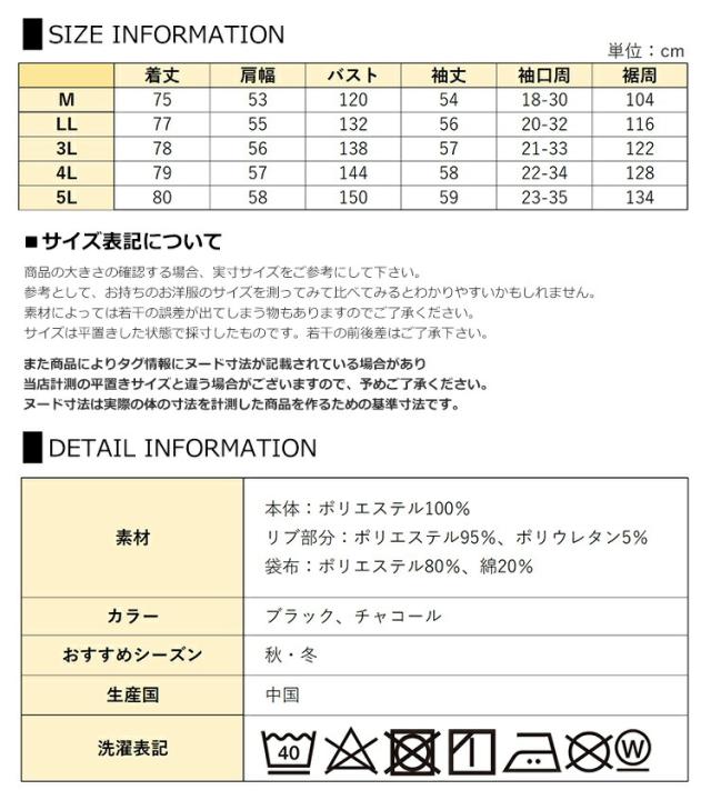 5L:着丈80 肩幅58 バスト150 袖丈59 袖口周23-35 裾周134