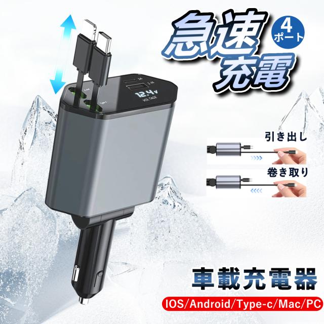【後部座席でも充電OK!】シガーソケット usb 車載充電器 巻き取り式 カーチャージャー 急速充電 4ポート Type-C Lightning USB 12V車 24V車 iPhone17/16/15/14/13/12 Galaxy Xperia Android 各種対応 多重保護 車用 充電器