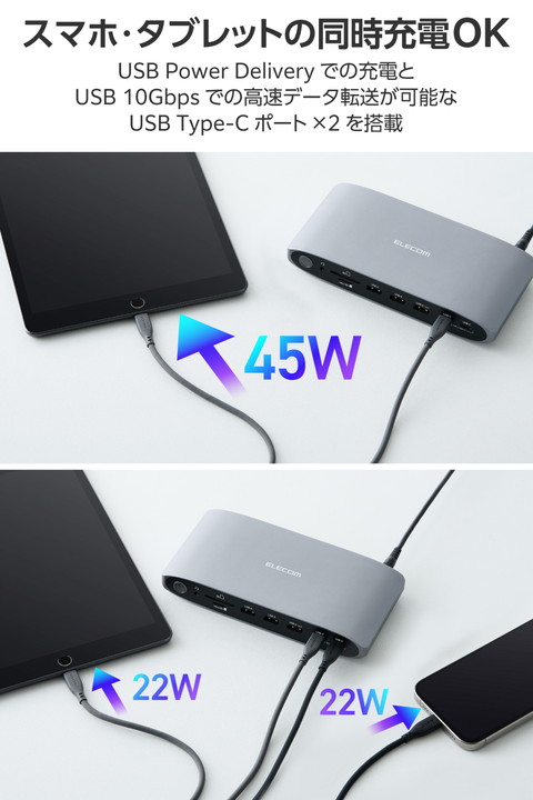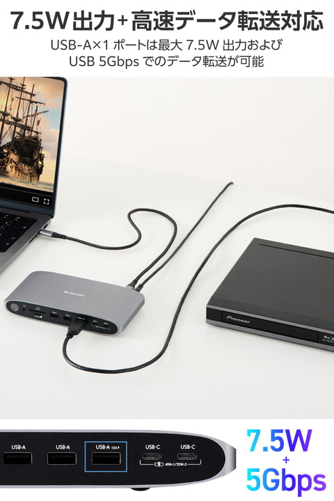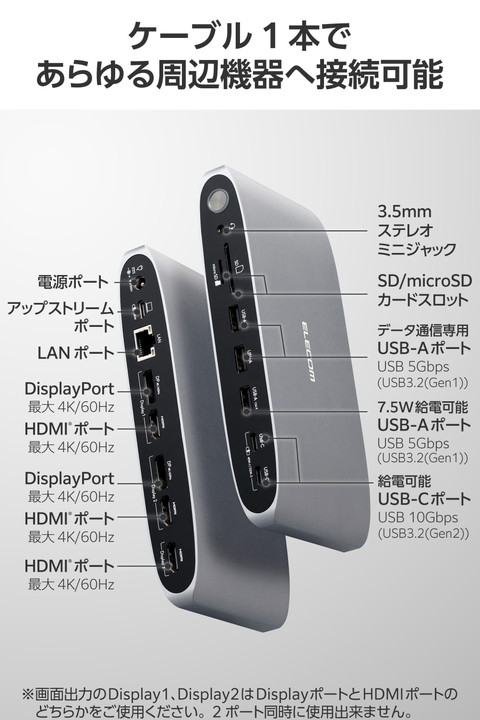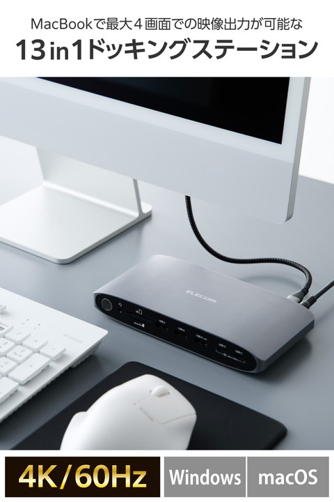 Macbookで最大4画面での映像出力が可能に!4つの異なるコンテンツを同時に楽しめる、13ポート搭載USB Type-C(TM)接続ドッキングステーションです。映像・音声出力、高速充電・データ転送、SDカードリーダーなど多彩な機能を搭載。作業効率をぐっと高めます。 ※最大4画面表示を行うには、Displaylinkドライバーがインストールされている必要があります。![]() ■MacBookで最大4画面での映像出力が可能。HDMI(R)ポート×3、DisplayPortポート×2から最大3ポートを自由に組み合わせて接続でき、パソコンの内蔵ディスプレイと合わせて4画面でそれぞれ異なるコンテンツを同時に楽しめます。 ■安定接続のための独自設計。送受信信号の認証試験にもとづく計測のもと、パソコンとドッキングステーション間で通信するデータ品質を安定させる設計に。接続デバイス間で生じやすい相性問題を最小限に抑え、スムーズな操作体験を提供します。 ■USB Type-C(TM)ポート搭載パソコンに13ポートを増設可能。さまざまなデバイスを1本のケーブルで一括接続できます。 ■HDMIポートとDisplayPortポートは4K/60Hzに対応し、高画質で映像・画像の出力が可能です。 ■※モニターの出力機能を正しく使用するために、最新のDisplayLinkドライバーをインストールしてください。 ■Windowsはもちろん、MacBookでもMSTに対応。ディスプレイへの拡張・ミラーリングで作業効率を格段に向上できます。 ■※MSTとは「Multi Stream Transport」の略称です。MST機能を使用することで、1つのコネクターから複数台のモニターに信号を出力することができます。 ■USB Type-C対応AC充電器を接続してパソコン本体の充電が可能。USB Power Delivery 最大100Wにてデバイス・本体へ給電できます。 ■※製品本体にて15Wを消費するため、実際の出力は最大85Wとなります。85Wで給電が必要な場合は、100W出力のAC充電器をご用意ください。 ■パソコン本体の充電用ポートとは別に、USB Power Deliveryでの充電とUSB 10Gbps(USB3.2(Gen2))での高速データ転送が可能なUSB Type-Cポート×2を搭載。スマホ・タブレットの充電も同時に行えます。 ■※1ポートのみ利用する場合は、最大45W出力が可能です。2ポート同時利用の場合は各ポート最大22.5W出力が可能です。 ■最大7.5W出力およびUSB 5Gbps(USB3.2(Gen1))でのデータ転送が可能なUSB-A×1ポートを搭載しています。 ■USB 5Gbpsでのデータ転送のみ可能なUSB-Aポート×2を搭載。USBメモリなどでのデータの読み書きもスムーズです。 ■※データ転送に使用するUSBポートでスマートフォン・タブレットを充電することはおすすめできません。 ■SDXC/SDHCに対応したSDカードスロットとmicroSDカードスロットを搭載しています。画像・動画などのデータ移行にも便利です。2つのカードスロットは同時に利用できます。 ■φ3.5mmステレオミニジャックで、イヤホンやヘッドホンを接続できます。Web会議やオンライン通話などもスムーズです。 ■インターネットの有線接続が可能なLANポートを搭載しています。 ■パソコン本体との接続は、最大10Gbps(理論値)の高速データ転送を実現するUSB 10Gbps(USB3.2(Gen2))に対応しています。 ■放熱性と耐ノイズ性に優れ、オフィスアイテムにも馴染むシックなアルミ筺体を使用しています。 ■※最大4画面表示を行うには、DisplayLinkドライバーがインストールされている必要があります。 ■※DisplayLinkドライバーのインストール方法は、本製品の裏面に記載されております。 ■※法人で導入を検討される場合は、ご購入前にお客様の環境での検証をおすすめいたします。 ■※接続するUSB Type-Cポート搭載機器の仕様の違いより、一部機能をご利用いただけない場合があります。 ■※パソコン充電用のUSB Type-C対応AC充電器は付属していません。別途ご用意ください。 ■※USB Type-Cポートからの充電に対応しないパソコンの場合、本製品のUSB Type-Cポート経由での本体充電はできません。充電を行う際は、パソコンがUSB Power Deliveryに対応していることを確認してください。 ■※USB Type-Cポートからの映像出力に対応しないパソコンの場合、本製品の映像出力ポートは動作しません。映像出力を行う際は機器がDisplayPort(TM) Alt Modeに対応していることを確認してください。 ■※本製品はOS起動前のシステム画面やBIOS画面では動作しません。 ■※本製品はパソコン本体のUSB Type-Cポートに直接接続してください。USBハブや増設ボードのUSB Type-Cポートに接続した場合、本製品をご利用いただけません。 ■※USB Type-C and USB-C are trademarks of USB Implementers Forum. ■自社環境認定基準を1つ以上満たし、『THINK ECOLOGY』マークを表示した製品です。 ■環境保全に取り組み、製品の包装容器におけるプラスチック重量を、社内基準製品より20%以上削減した製品です。 ■環境保全に取り組み、製品の包装容器が紙・ダンボール・ポリ袋のみで構成されている製品です。 ![]() ■対応OS(Windows):Windows 11/10 ■対応OS(macOS):macOS Sonoma 14/macOS Ventura 13/macOS Monterey 12 ■対応OS 備考:※各OSの最新バージョンへのアップデートや、サー