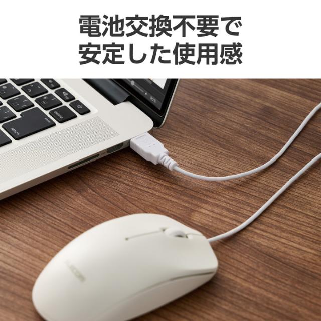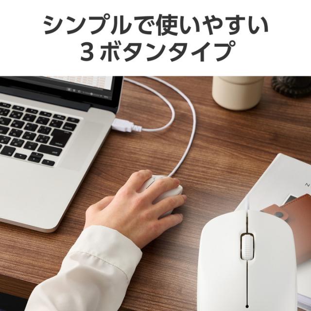 リーズナブルながらマウスの基本性能をしっかり備え、各種認証に適合。オフィスでの使用にぴったりのシンプルな3ボタンマウスです。電池交換や充電が不要で、挿してすぐに使える有線接続モデルです。
