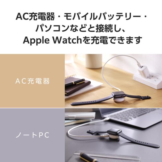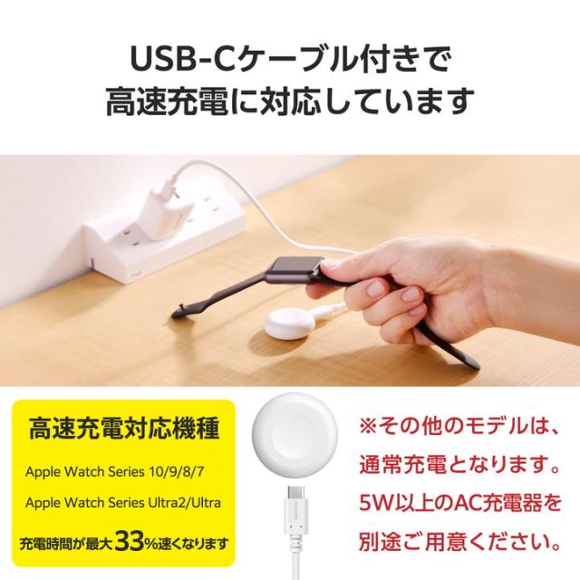 高速充電に対応した、持ち運びしやすいApple Watch充電器です。お手持ちのUSB Type-C(TM)ケーブルでAC充電器、モバイルバッテリーおよびパソコンと接続することによりApple Watchを充電することができます。Apple正規認証であるMade for Apple Watchを取得しています。 ※高速充電にはApple Watch Series 7以降のモデルが対応しています。他のモデルは通常の充電速度になります。