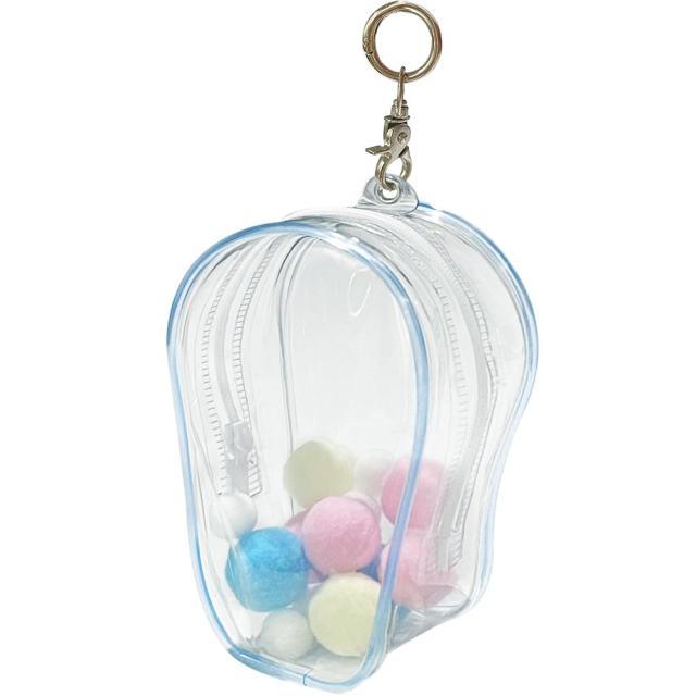 【外観】可愛い頭でっかち型ぬいぐるみポーチは透明なPVCを採用して、耐久性があり、ジッパー式。厚みのあるキーホルダーのフックは上部の金属リングで留める可能、キーリングはカバンにひっかけるデザイン。ポンポンボール付き、いらない場合は取り出してください。