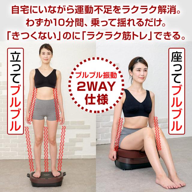 10分間で最大約6,300回の振動で体がブルブルと揺らされ、筋肉を刺激することで、 全身の筋トレ・有酸素運動・ストレッチが同時にできます。