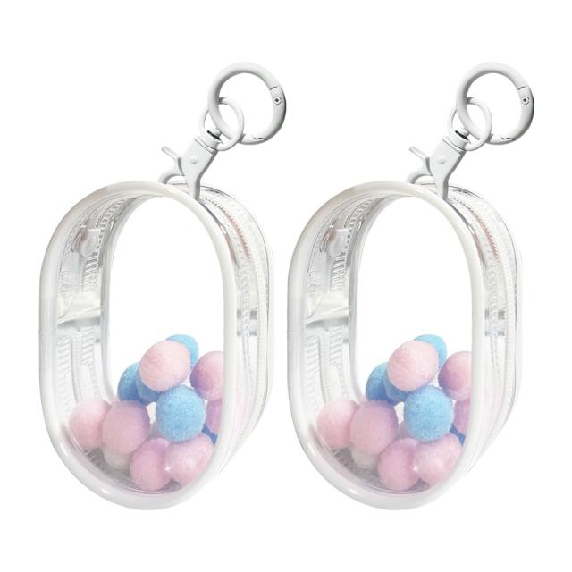 【外観】透明なPVCを採用して、耐久性があります。痛バックは前後透明、スムーズなジッパーのデザイン。上に取り外し可能の丸いキーリング付き、カバンにひっかける用デザインです。透明ジッパーのデザイン、ジッパーの両側にプリントが入っています。柔らかいポンポンボールセットを差しあげます、いらない場合は取り出してください。