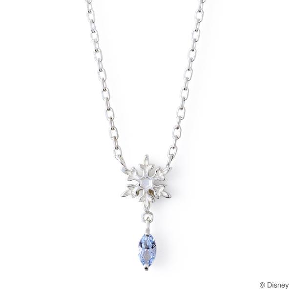 【素材】SV925 シルバー/Nanogems 【サイズ】約12.7×5.6×2.5 mm (縦×横×厚み) 【付属品】THEKISS専用ケース/手提げ袋 【コメント】雪の結晶モチーフが目をひくネックレス。 マーキスカットのブルーストーンが、美しく氷の世界を引き立てます。 モチーフとストーンを繋ぐカンも、結晶をイメージし六角形にデザイン。 どの角度からを見ても、アナと雪の女王の世界観を感じられるジュエリーです。 ※全てギフト仕様のBOXにてお届けさせていただきます。プレゼントにも安心してご利用くださいませ。