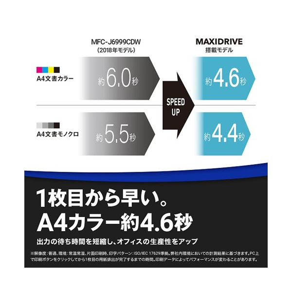 ●1枚目の印刷時間がA4カラー約6.0秒、A4モノクロ約5.0秒と高速。
