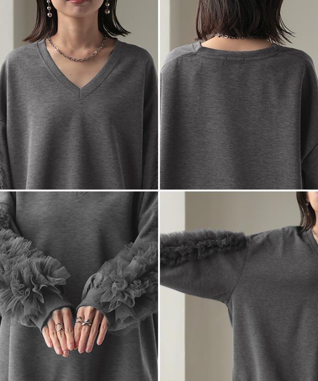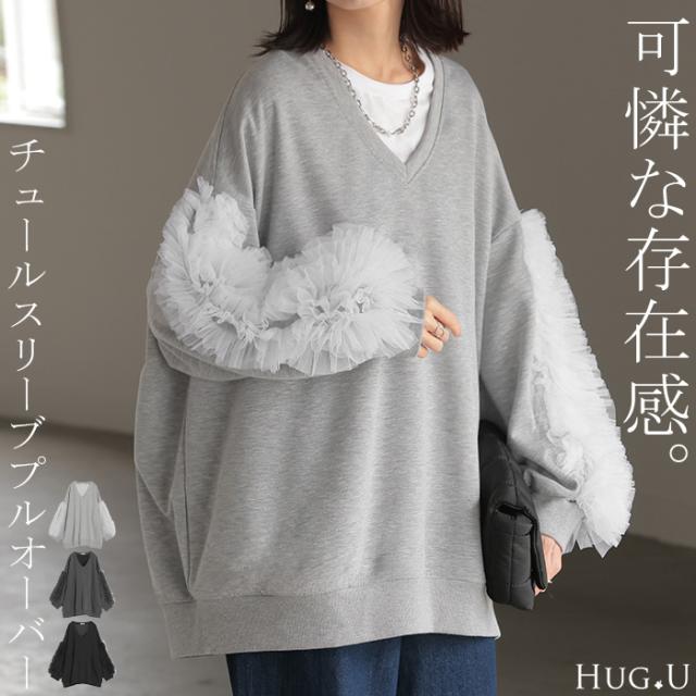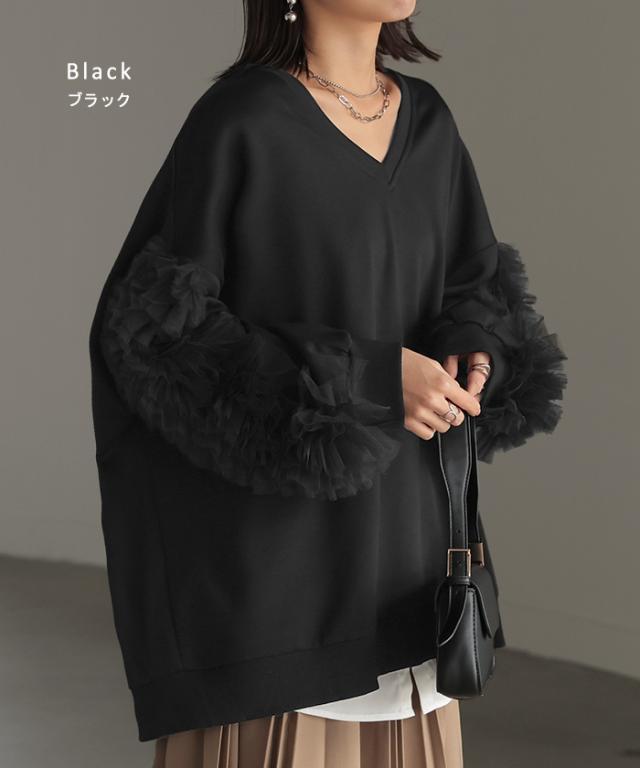 チュール 袖 ドッキング プルオーバー ■ レディース チュニック ダンボール トップス ロング オーバー 無地 長袖 長い ドルマン Vネック ボリュームスリーブ リブ オーバーサイズ ゆったり 体型カバー 大きいサイズ お尻が隠れる 黒 秋 冬 HUG.U 秋新作