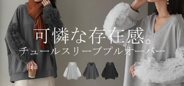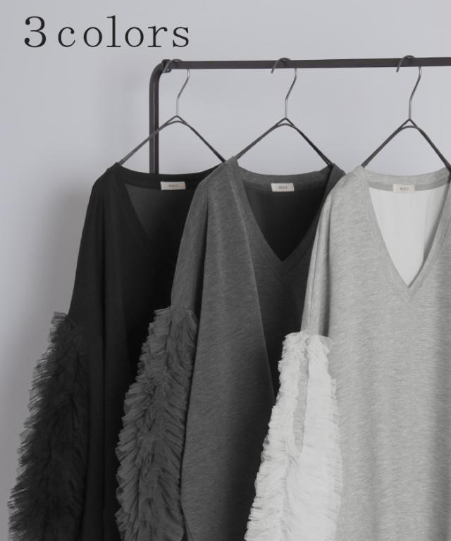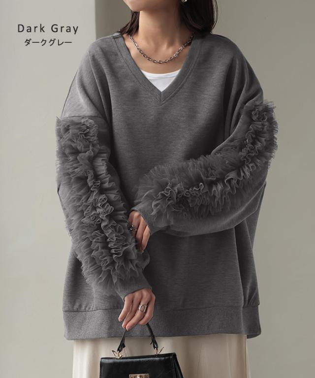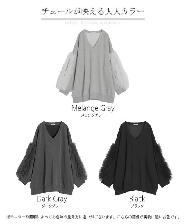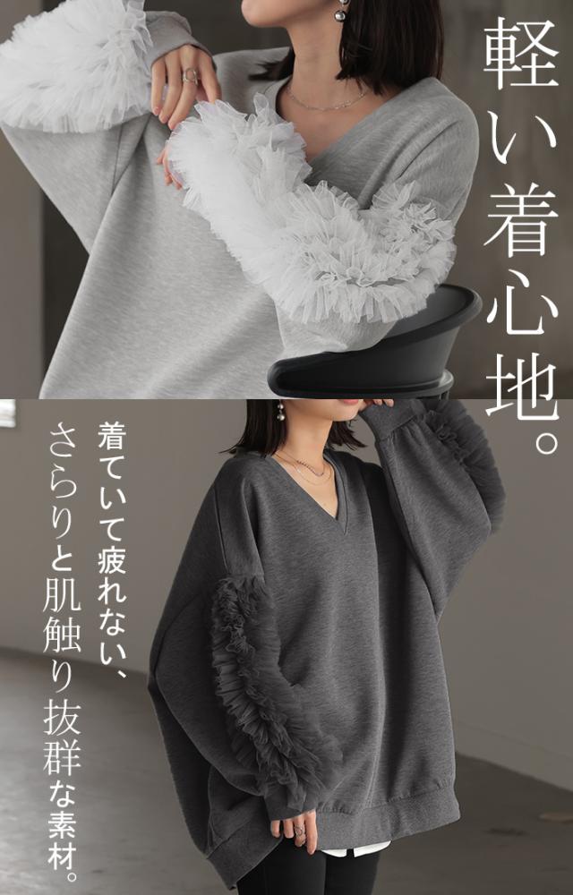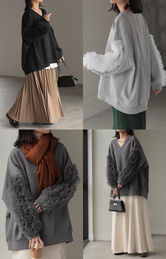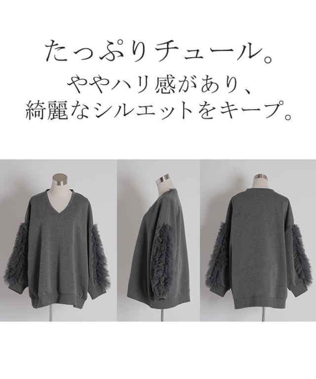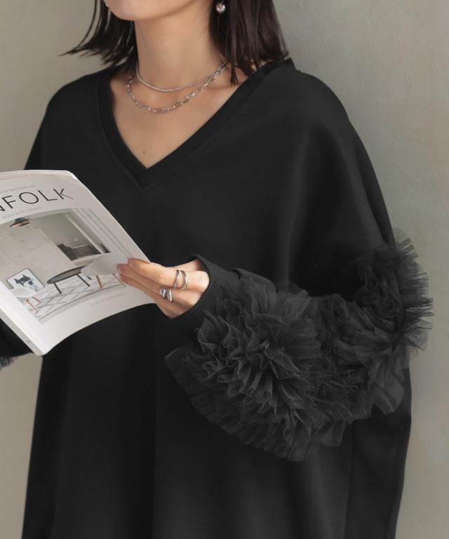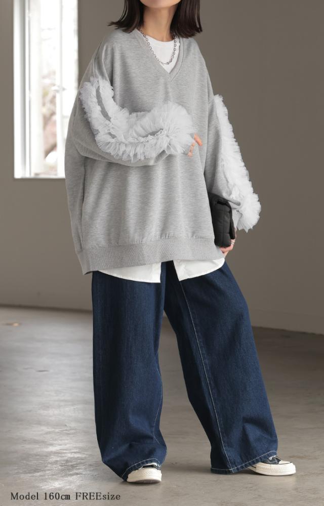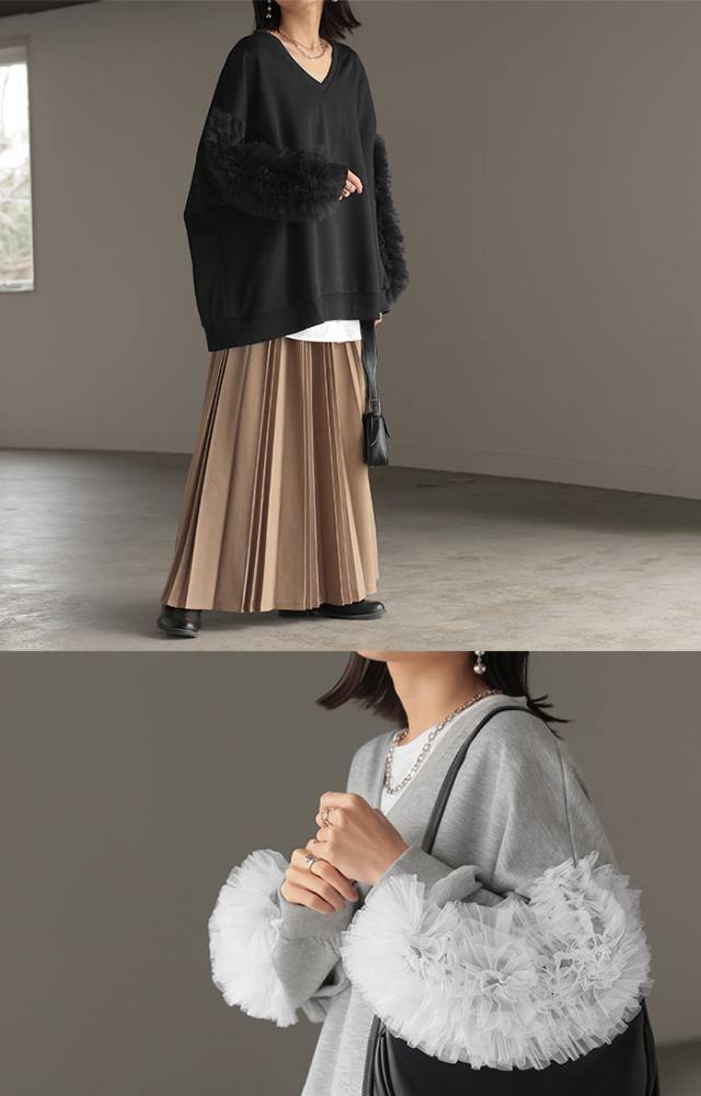 袖のチュール素材とスウェットがドッキングしたデザインプルオーバーです。