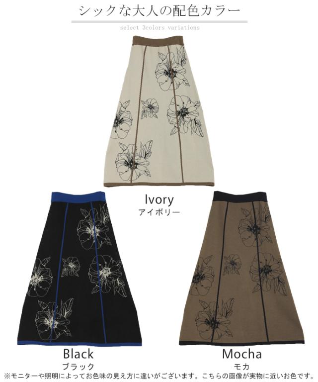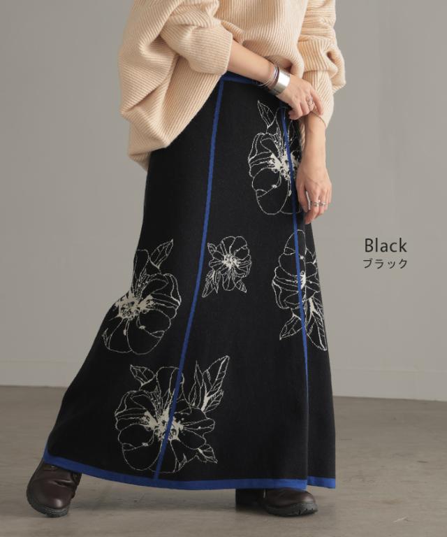 ニット スカート 花柄 ジャガード レディース ロングスカート ニットスカート Aライン ボトムス フレア 柄 ライン ハイゲージ おしゃれ ゴム ロング マキシ ナチュラル マキシスカート ゆったり 体型カバー 暖か 大人 黒 茶色 秋 冬 HUG.U 秋新作