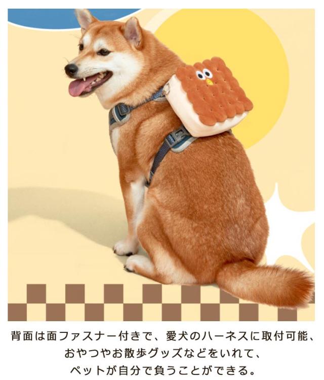 | 飼い主と愛犬が兼用できる可愛いバッグ。 肩紐付属で、ショルダーバッグとして、活躍可能。 背面は面ファスナー付きで、愛犬のハーネスに取付可能、おやつやお散歩グッズなどをいれて、ペットが自分で負うことができる。 繊細な刺繍と可愛いビスケットモチーフデザイン、見ているだけで癒される多機能バッグです。 | |