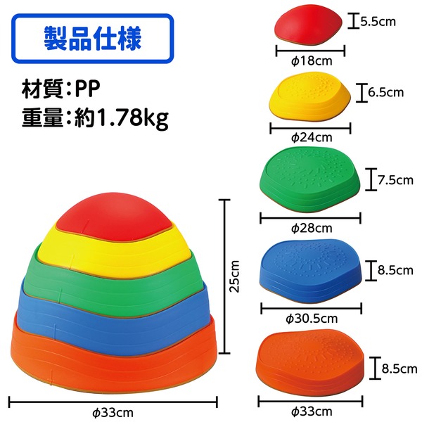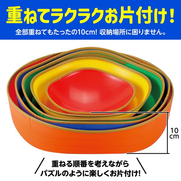 ●商品サイズ(mm):本体A(オレンジ):φ330mm、本体B(青):φ305mm、本体C(緑):φ280mm、本体D(黄):φ240mm、本体F(赤):φ180mm、重ねた時の高さ:250mm