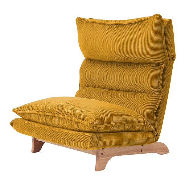 リラックスしながらくつろげる、足付きの1人掛けローソファ 低い フロアタイプ ロータイプ フロアソファ 柔らかなコーディロイ素材を使用したイエローカラーで、心地よい空間を演出 黄 脚付きリクライニングローソファ 低い フロアタイプ ロータイプ フロアソファ 1人掛け コーディロイイエロー 黄