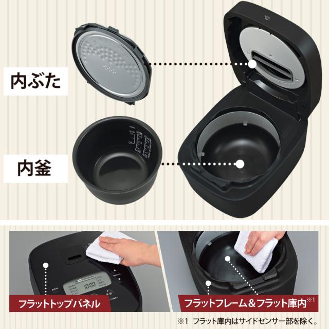 毎回洗う点数は、はずして洗える内ぶたと内釜のたった2点だけです。本体は凸凹が少ないフラットな構造なのでお手入れしやすいです。