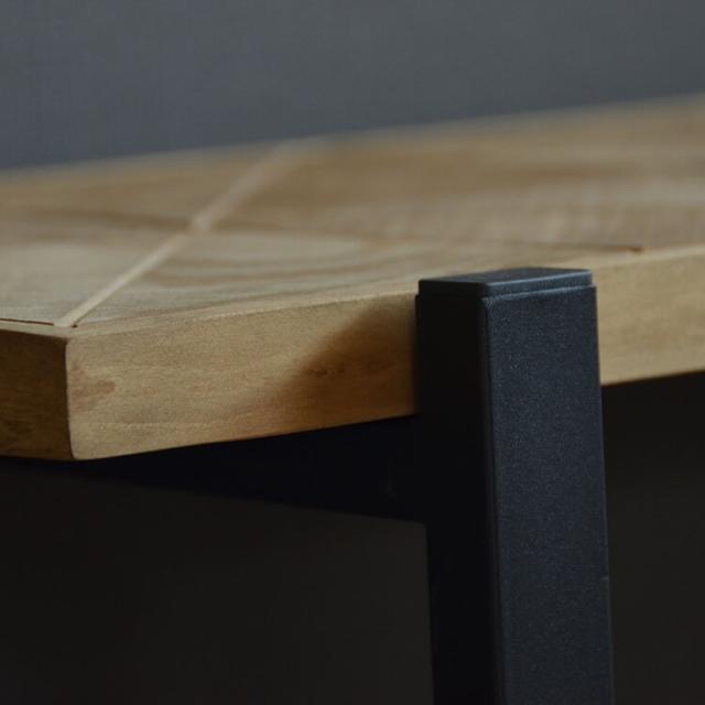くっきりとした木目が特徴的なパイン材(マツ)を幾何学的に配置し、個性的な天板に仕上げた古材風2段ラックKaleido(カレイド)。