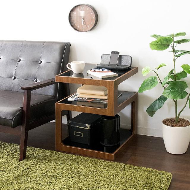 四角いキューブ型をくり抜いたようなスタイリッシュなガラス天板と木製フレームのサイドテーブル『Clove(クローブ)』。ソファやベッドサイドでちょっとした物を置くのに最適。