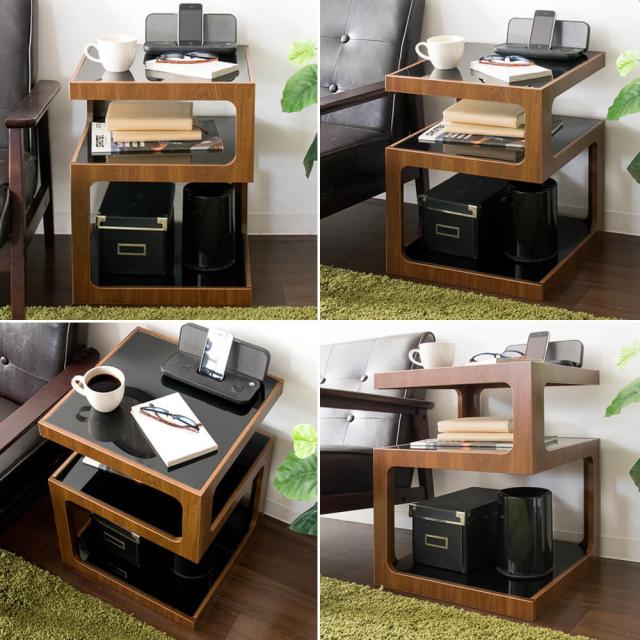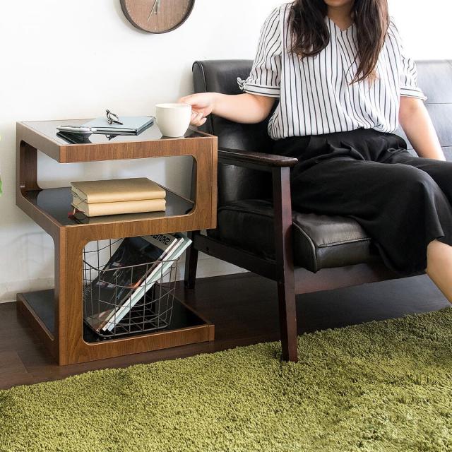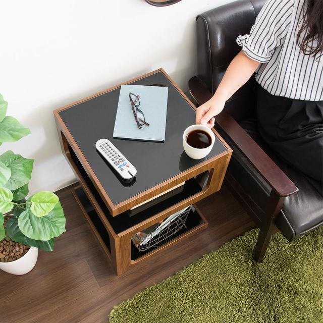 天板の下はガラス板のおしゃれなオープンスペースが2段あり、雑誌や新聞、高さのあるものも分けて収納できます。