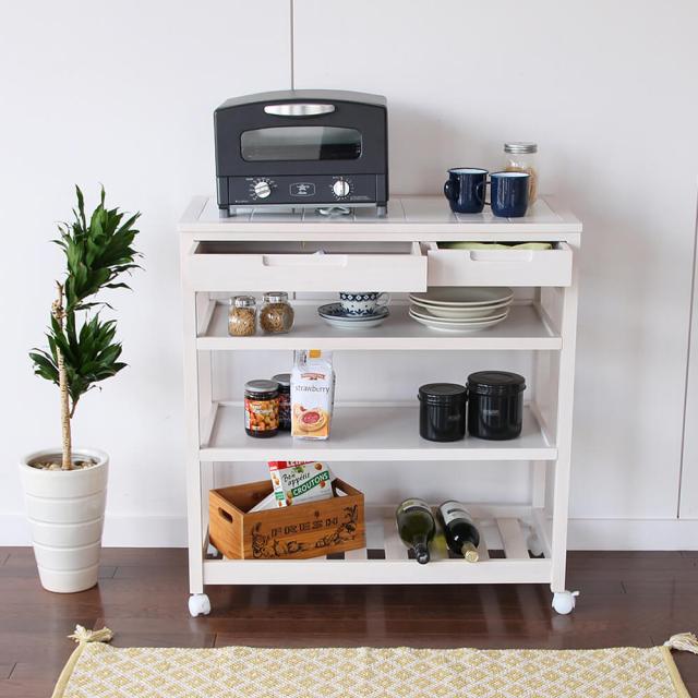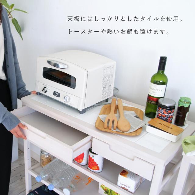 熱いお鍋などが置けるタイルトップ、キッチン用品がたっぷり収納できる引き出し、高さ調節可能な棚板、収納力と機能性を兼ね備えております。