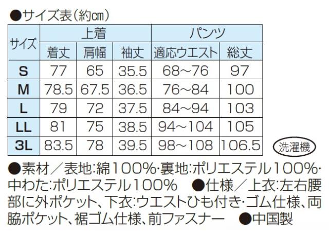 ●仕様/上衣:左右腰部に外ポケット、下衣:ウエストひも付き・ゴム仕様、両脇ポケット、裾ゴム仕様、前ファスナー