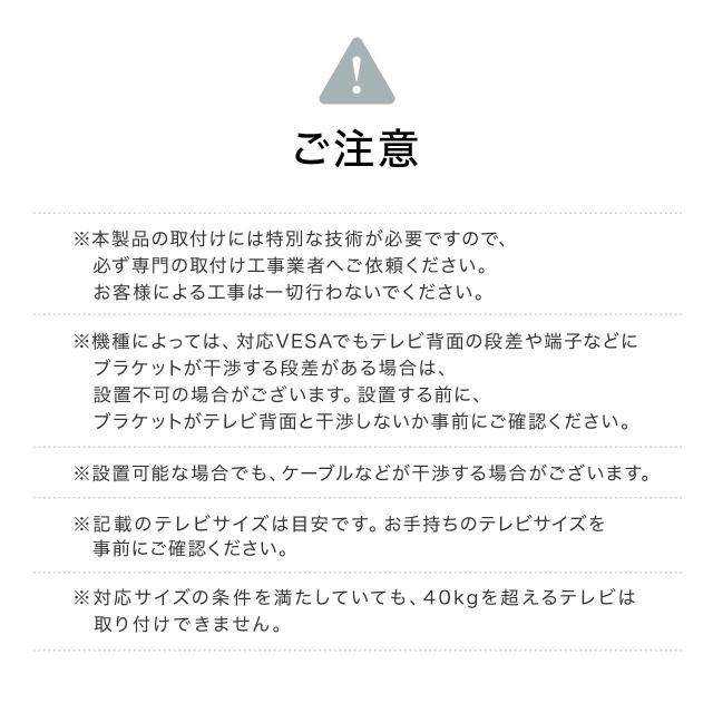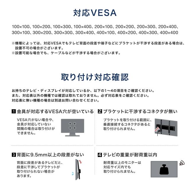 ■対応VESA:100×100、100×200、100×300、100×400、200×100、200×200、200×300、200×400、300×100、300×200、300×300、300×400、400×100、400×200、400×300、400×400