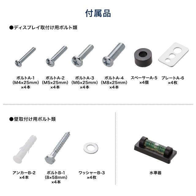 ■対応サイズ・VESA:100×100、100×200、100×300、100×400、200×100、200×200、200×300、200×400、300×100、300×200、300×300、300×400、400×100、400×200、400×300、400×400搭載で、40kgまで70インチまでのディスプレイ・モニター