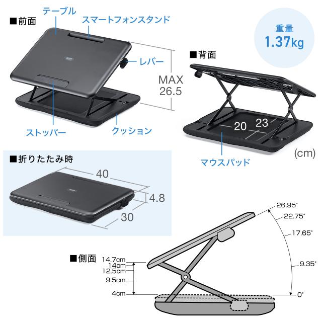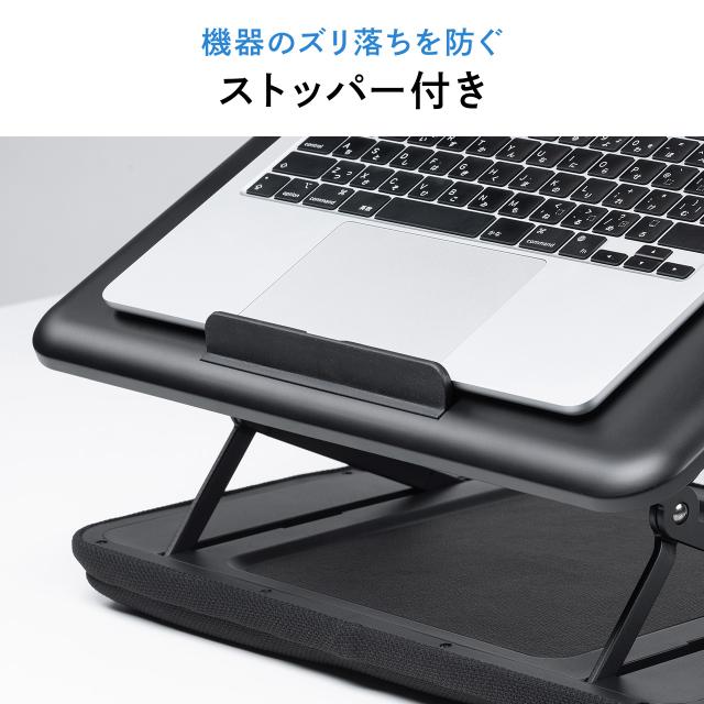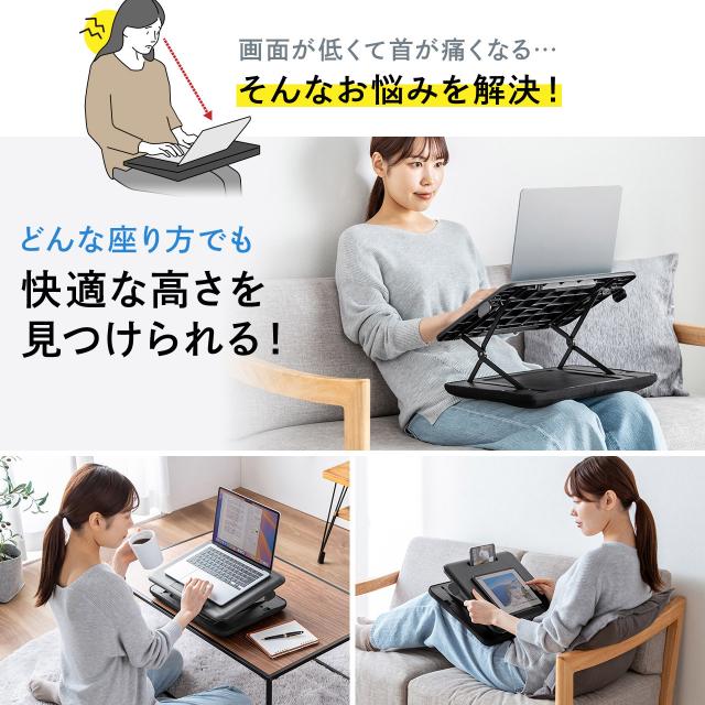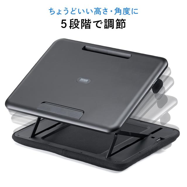 ●膝上だけでなく机の上でノートパソコンスタンドとしても便利です。●スムーズな高さ調節ができ、5段階で使用できます。