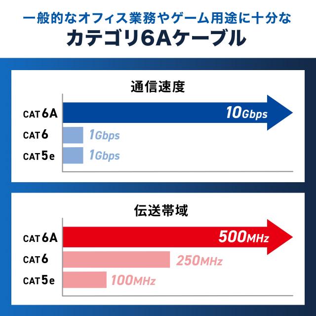 ●コネクタ部が上下左右に曲げ固定できる、カテゴリ6A規格対応のLANケーブルです。●超高速の10ギガビット・イーサネット(10GBASE-T)環境に対応しています。