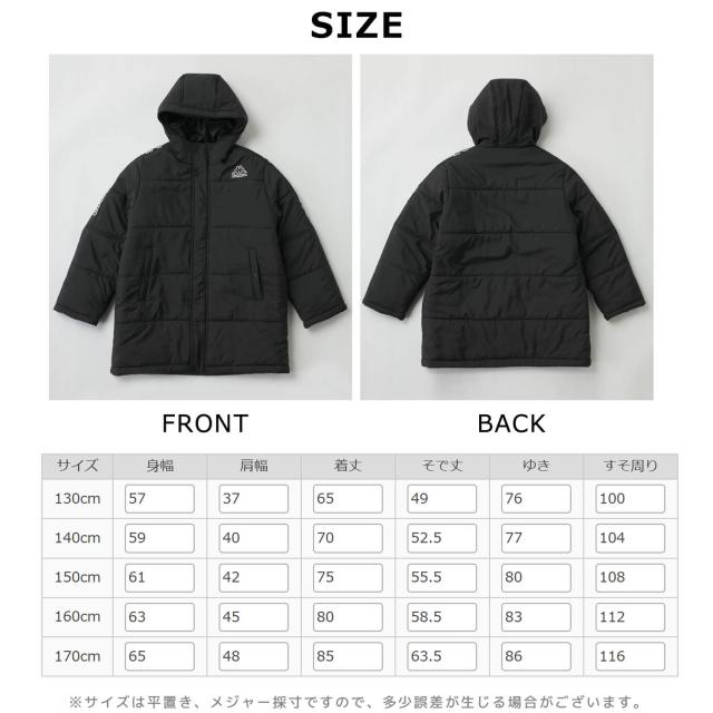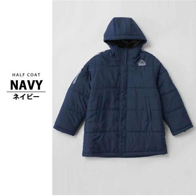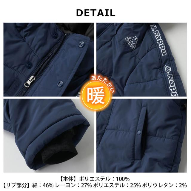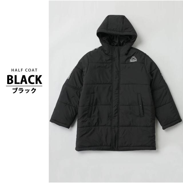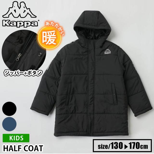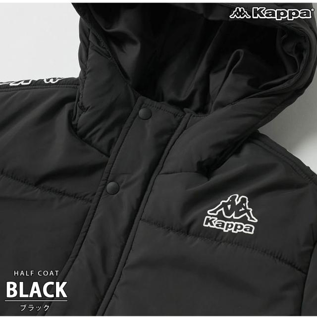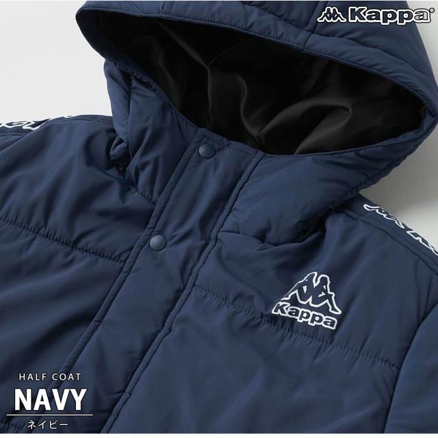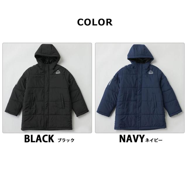 【40%OFF】Kappa 中綿ジャケット カッパ キッズ ジュニア 長袖 防風 防寒 保温 あったか フード付き ミドル丈 フルジップ サッカーウェア フットサルウェア スポーツブランド ハーフコート ブルゾン 上着 アウター 130 140 150 160 170 黒 紺 秋冬 2024fw
