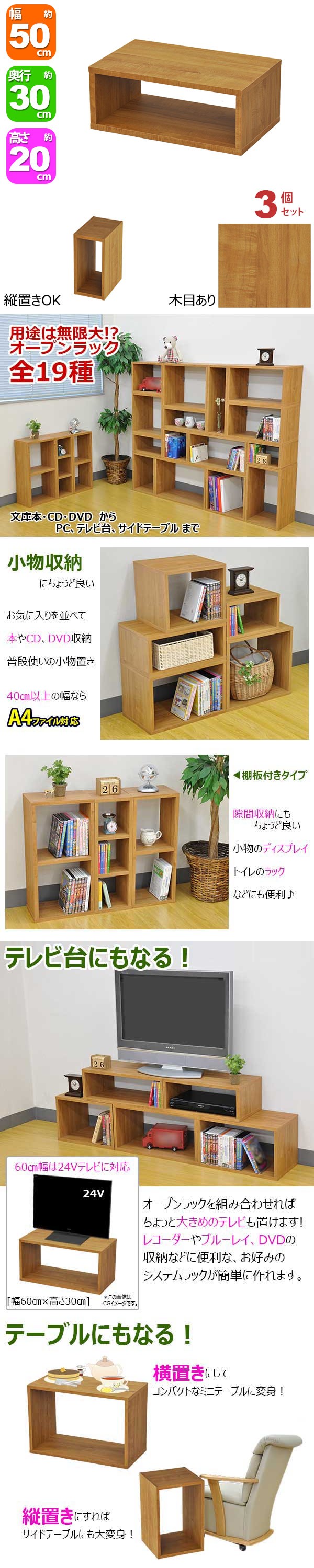 オープンラック 1段 50×20 3個セット 奥行30cm 収納 棚 A4対応 ブラウン 茶色 おしゃれ 組み合わせ自由 幅50cm 高さ20cm 頑丈 耐荷重20kg 積み重ね 収納 ラック ディスプレイラック 卓上ラック 飾り棚 本棚 コミック 漫画 雑誌 アクスタ 机上ラック モニター台 木製