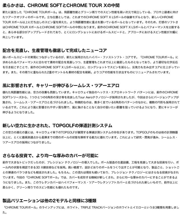 【LSから受け継ぎ、超えた飛距離性能 強弾道で握るビッグアドバンテージ】CHROME SOFT X LSボールも、最新のリニューアルにおいて、「CHROME TOURボール」へと名称をチェンジし、特徴である飛距離を重視した性能もさらにブラッシュアップがなされました。専用設計のハイパー・ファストソフト・コアは、素材の配合を新しくしたことなどで、優れた反発力を発揮するものとなっており、ボールスピードが大きく向上。やや柔らかな設定によって、ロングショットにおけるスピンも抑えられており、ここにシームレス・ツアーエアロによるキャリーの伸びが加わることで、飛びのポテンシャルは格段にアップしています。言うまでもなく、ショートゲームでのスピン量も充分で、新しいハイパフォーマンス・ツアーウレタンソフトカバーが、ツアーで戦えるレベルを実現しています。CHROME SOFTボール、CHROME TOUR Xと同じく、カラーやアライメント別に計3種類での展開です。