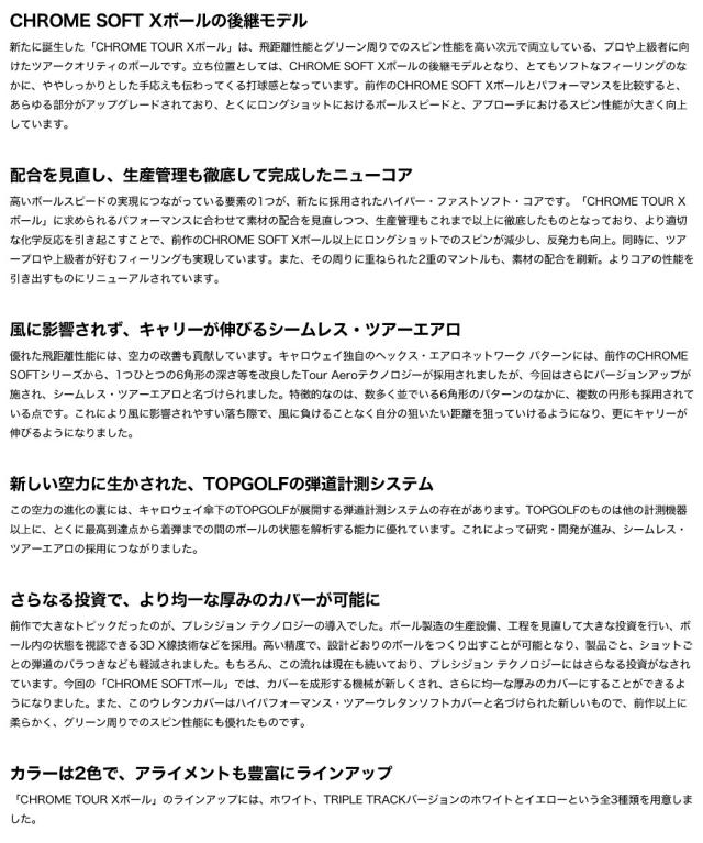 【飛び、スピン、フィーリング── より万能性を高めて、新たな名称に】飛距離性能とグリーン周りでのコントロール性能を、バランス良く、ハイレベルで備えたCHROME SOFT Xボールが、名前を「CHROME TOUR Xボール」に変えて、さらにパフォーマンスアップを果たしました。新しいハイパー・ファストソフト・コアは、素材の配合の再考や徹底した生産管理により、プロや上級者が望む打感を従来以上に突き詰めつつ、ロングショットでの高いボールスピードを実現。弾道の頂点から落ち際までを徹底的に分析して生まれた、モデル別専用設計のシームレス・ツアーエアロも、ビッグキャリーで大きな飛びに貢献しています。新たにハイパフォーマンス・ツアーウレタンソフトカバーと名づけられたカバーは、より柔らかくなり、ショートゲームでのスピン量も増大。プレシジョン テクノロジーへの引きつづきの投資によって厚みも均一化され、ショットごと、個体ごとの結果のバラつきも軽減されています。ラインアップはCHROME SOFTボール同様、カラーやアライメント別に計3種類です。