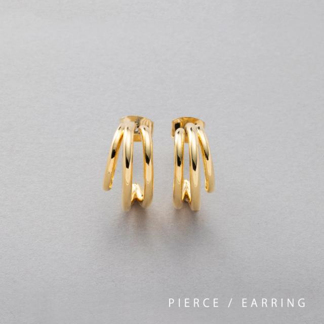 3つのフープラインが連なるレイヤード風ピアス/イヤリング。シンプルなフープを重ね着けしたようなフォルムがさりげなく存在感あるモダンデザインで大人顔をメイク。大人コーデにひとつ加えて格上げして◎