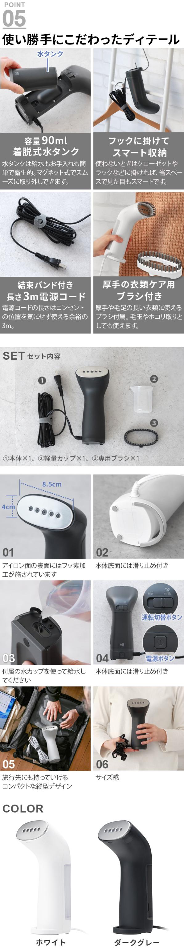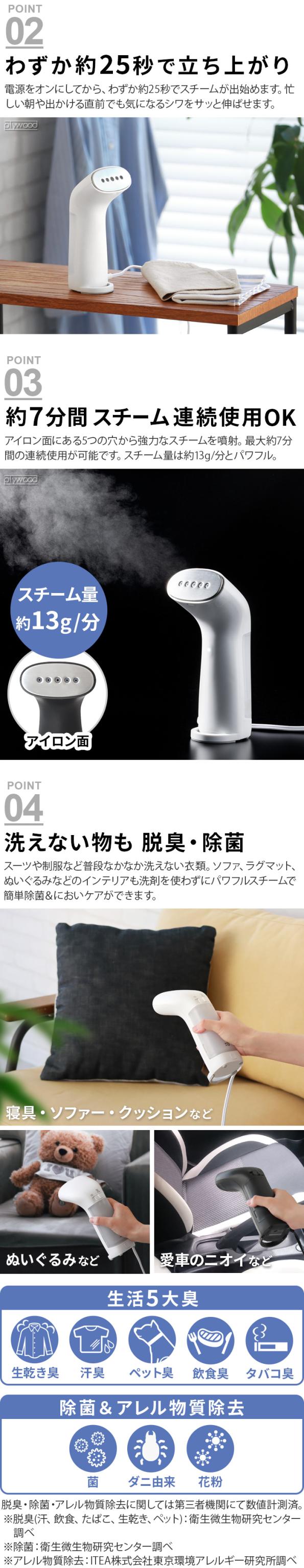 | 約25秒の素早い立ち上がり スチーム量:約13g/分 着脱式水タンクで給水も簡単 温度ヒューズ:240℃ |