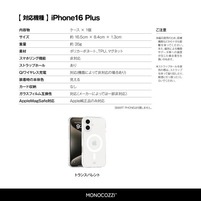 iPhone 16 Plus ケース クリア MagSafe 対応 ストラップホール 付き 薄型 軽量 スマホケース マグセーフ 耐衝撃 スリム 透明 スマホカバー [ iPhone16 Plus アイフォン 16 プラス 対応 ] MONOCOZZI ESSENTIALS