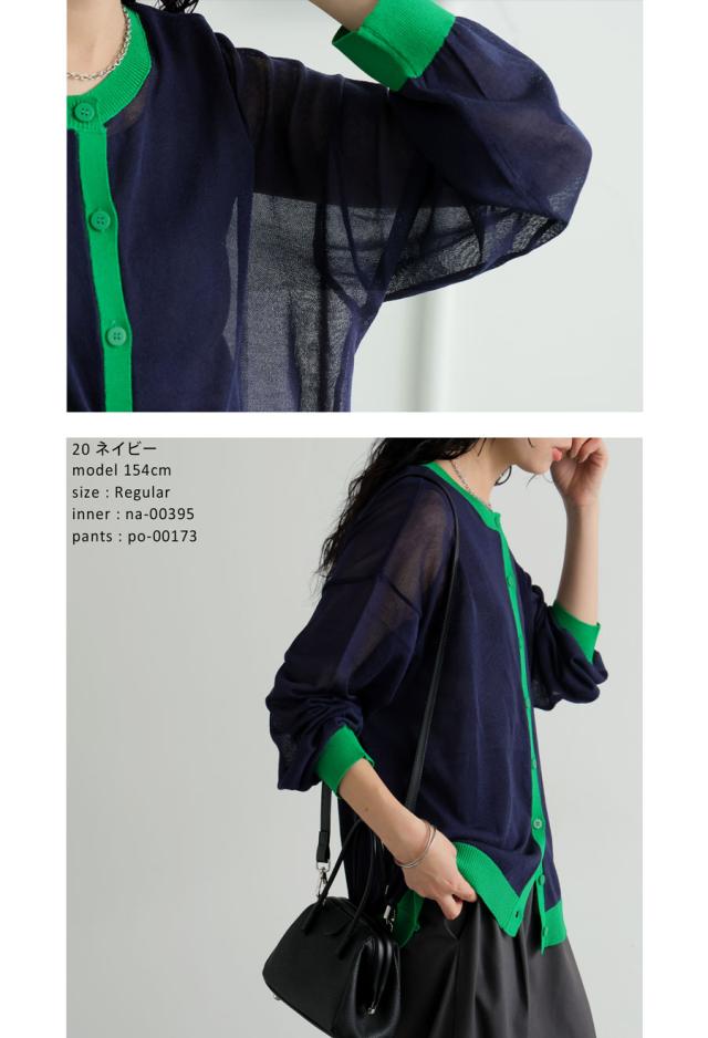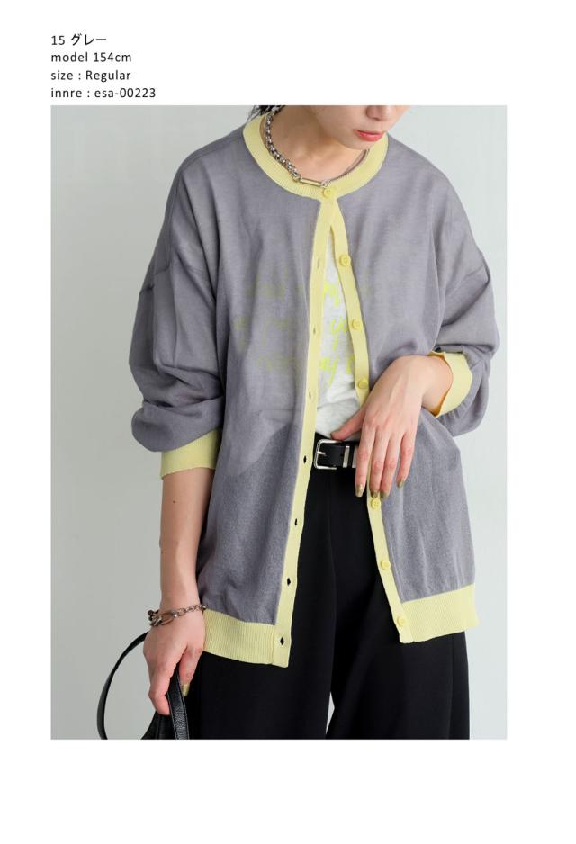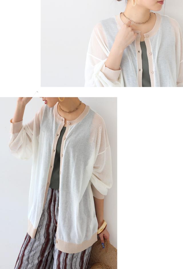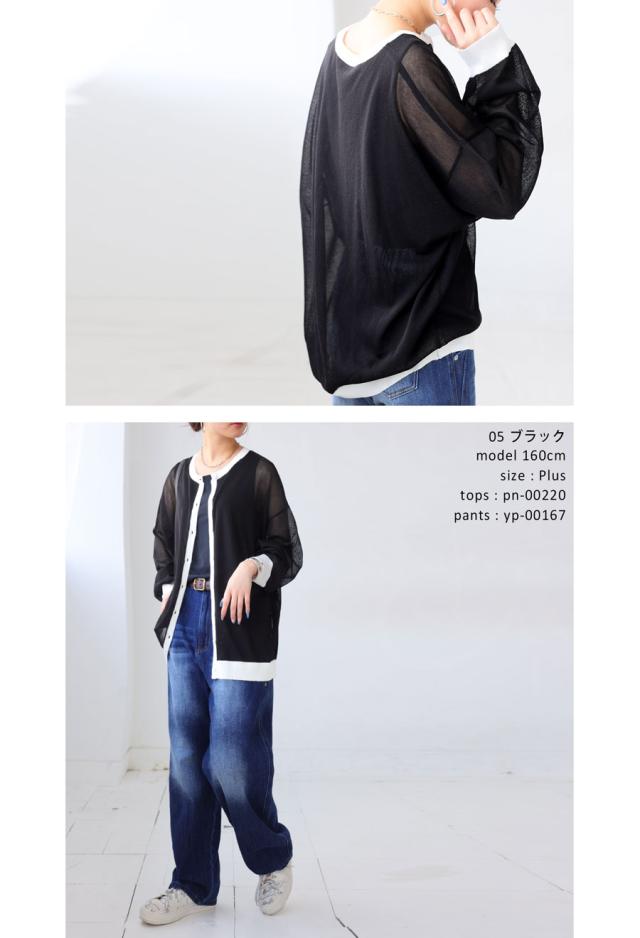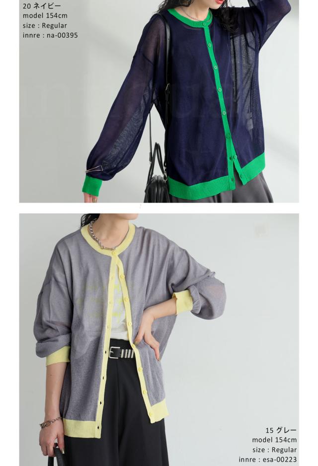 pn-00553 トップス 長袖 シアー 配色 無地 丸首 ラウンドネック 透け 透け感 シアー素材 レイヤード 重ね着 羽織り 前開き シアーニット カーデ 薄手 シンプル シースルー