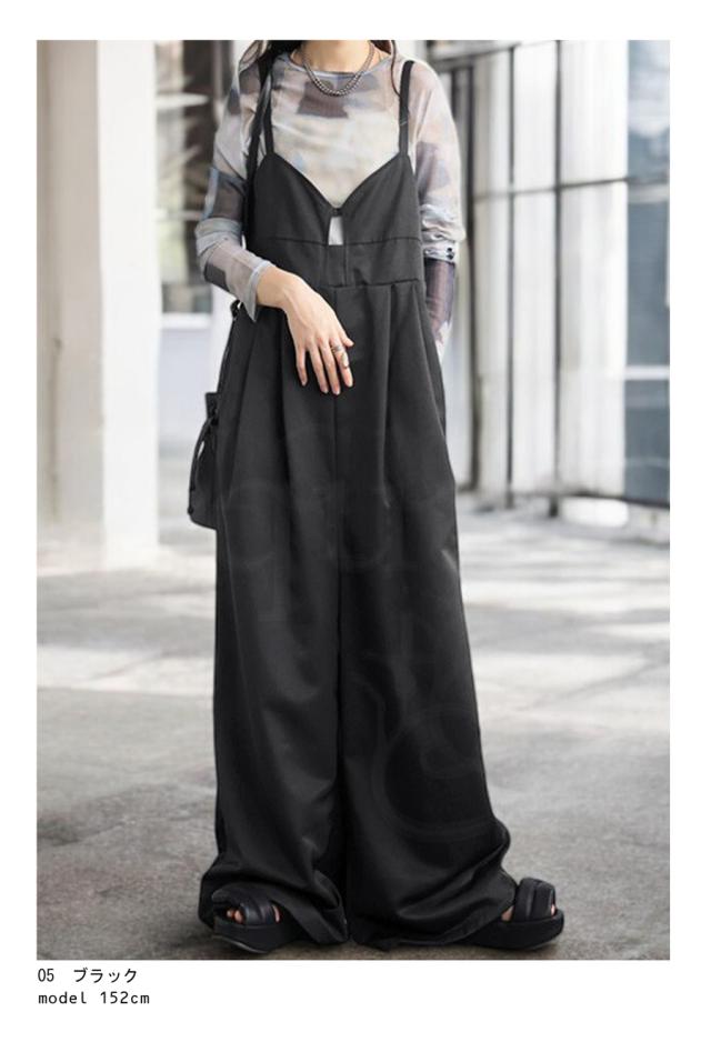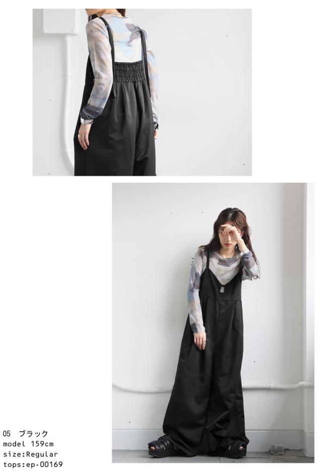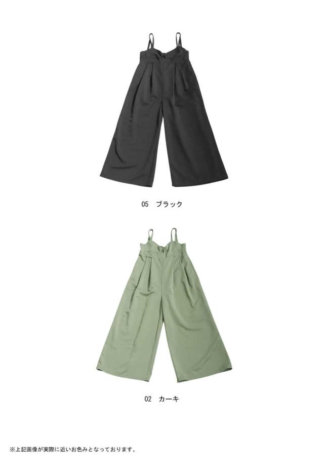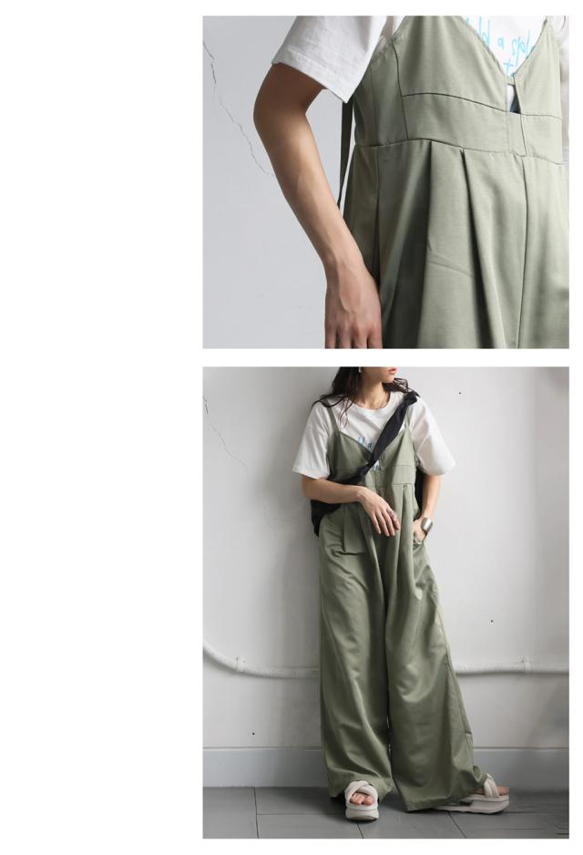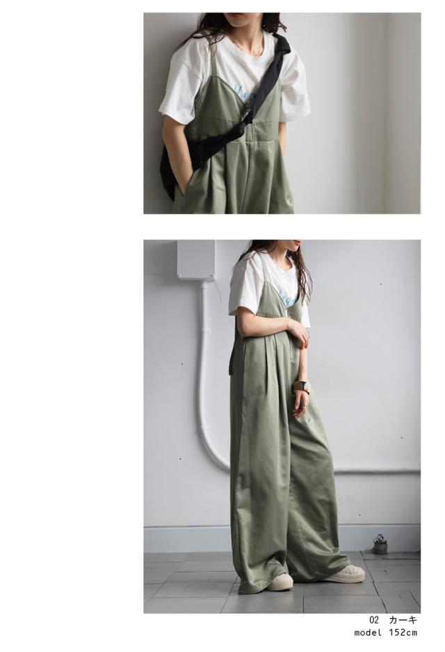 ep-00195 ノースリーブ ロング 長ズボン 無地 ツイル ツイル生地 ワイドパンツ ワイドシルエット ワイド タック 後ろゴム Vネック サイドファスナー 肩紐調整可 ポケット付き ゆったり