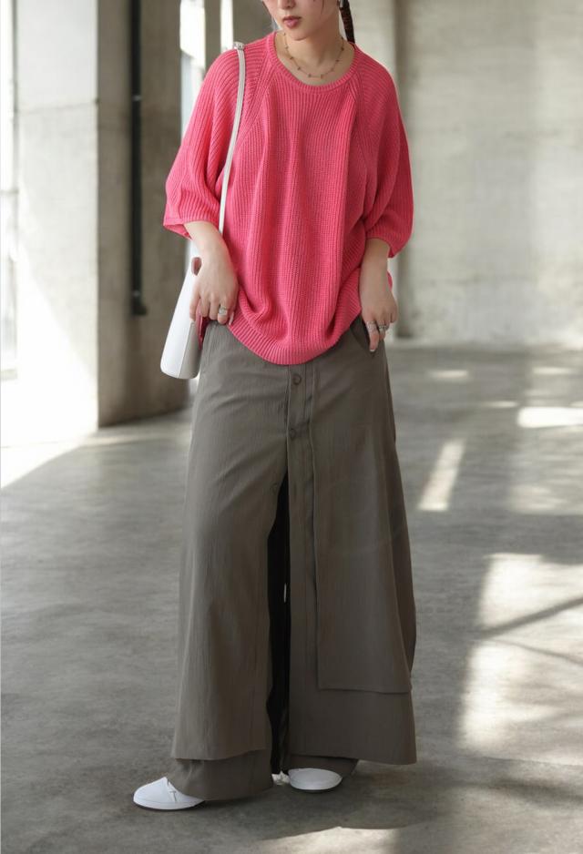 シンプルなボトムスに合わせるだけで、旬のスタイリングが即完成!