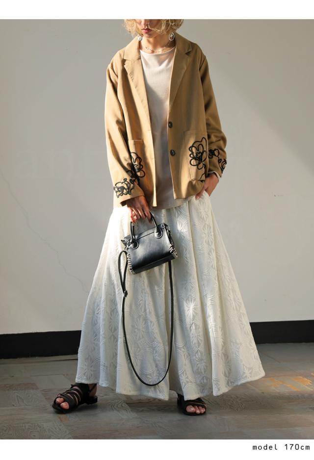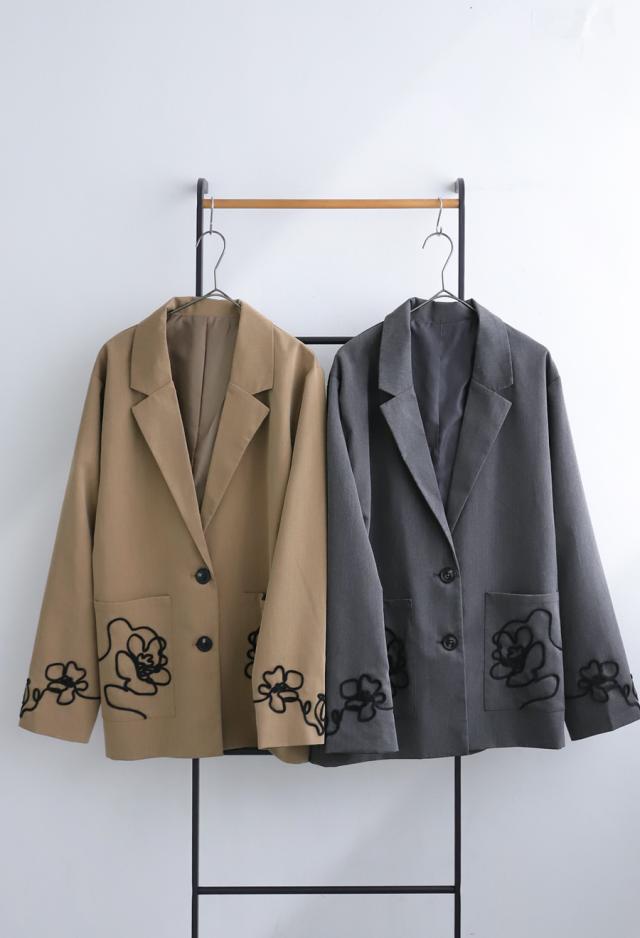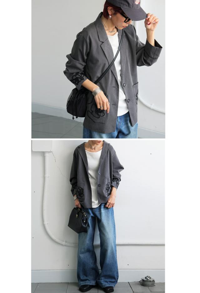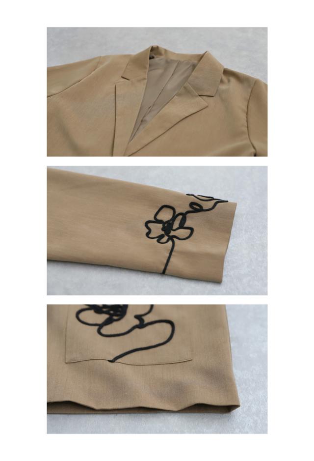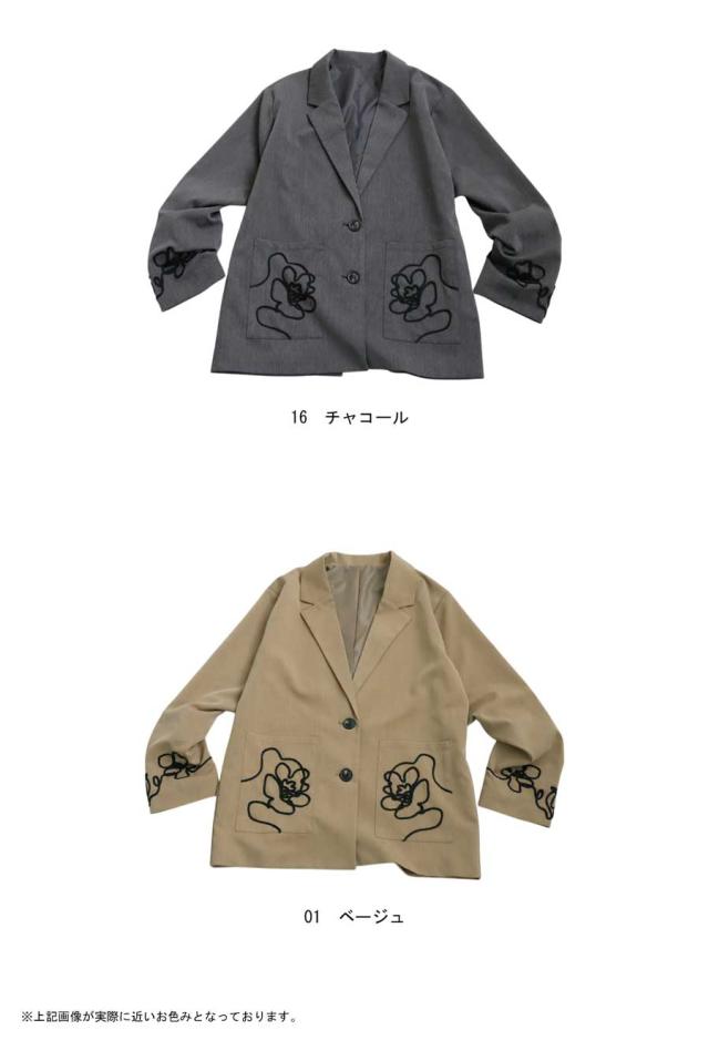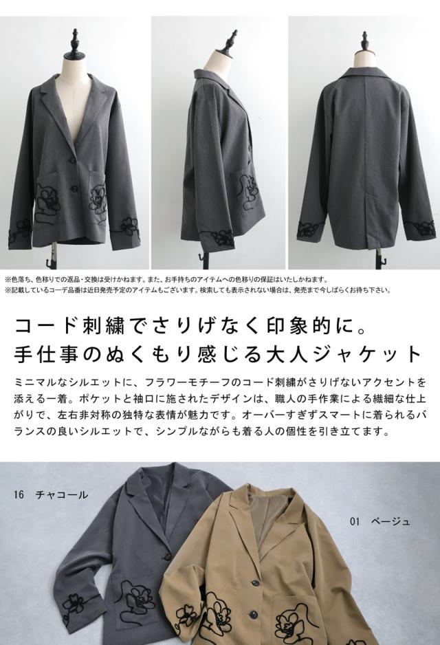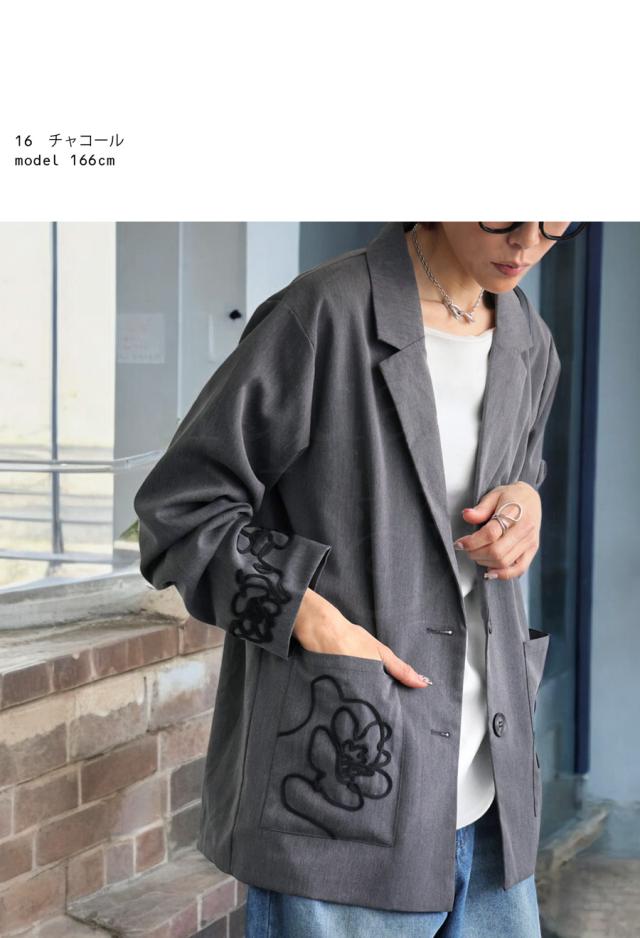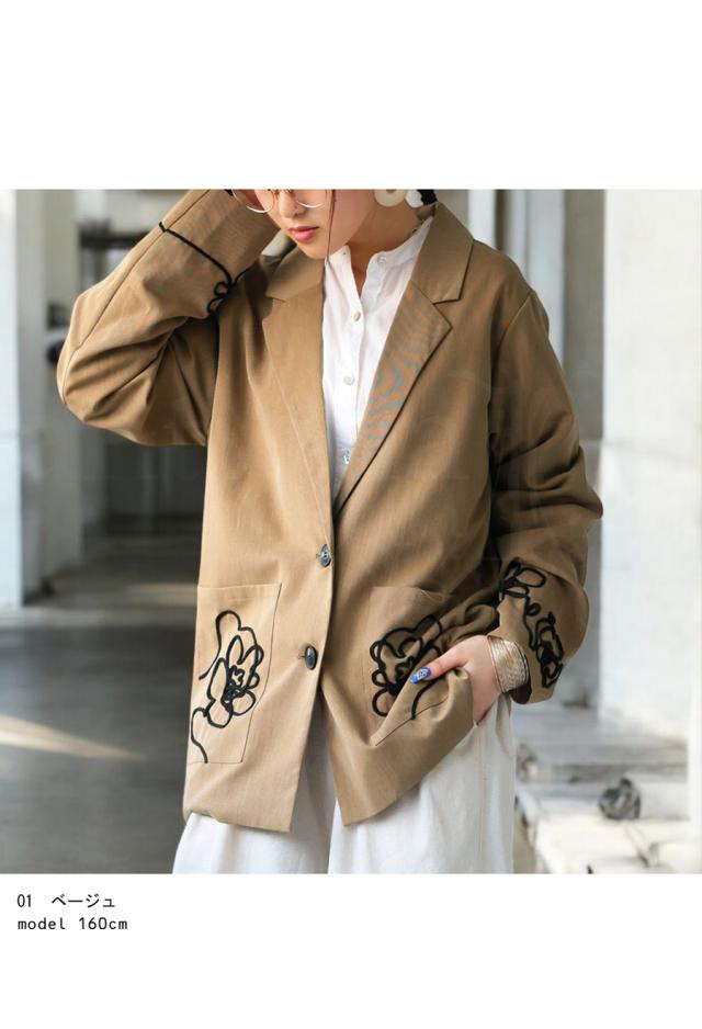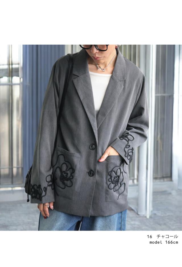 esa-00220 長袖 テーラードジャケット 羽織り コード 手縫いコード 花柄 アート風刺繍 アシメ アシンメトリー 左右非対称 オーバーサイズ ポケット付き 大人カジュアル シンプル