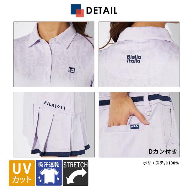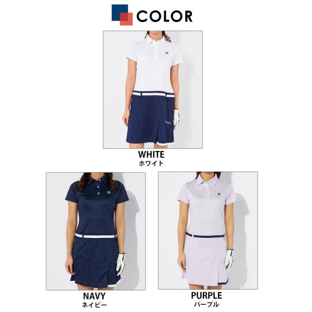 【30%OFFセール】 FILA GOLF/フィラゴルフ ゴルフウェア ワンピース 半袖 レディース 春 夏 吸汗速乾 ドライ UVカット 紫外線対策 ストレッチ伸縮性 プリーツ ジャガード 総柄 脚長効果 細見え ポケット付き Dカン付き ブランド ロゴ おしゃれ きれいめ 2024ss