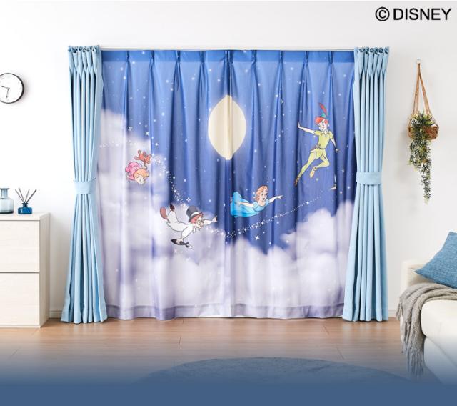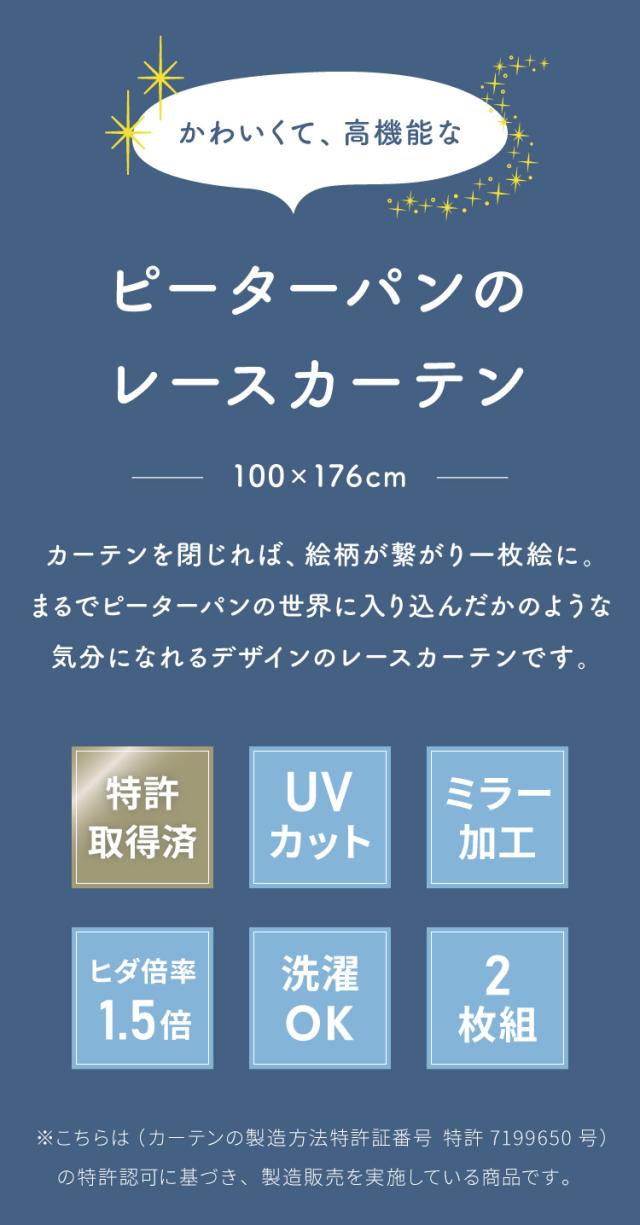 ピーターパン絵羽レースカーテン 2枚組 100×176cm UVカット 洗える 洗濯 プライバシー 目隠し フック付き カーテン 紫外線 おしゃれ かわいい ディズニー ピーターパン ティンカーベル ウェン
